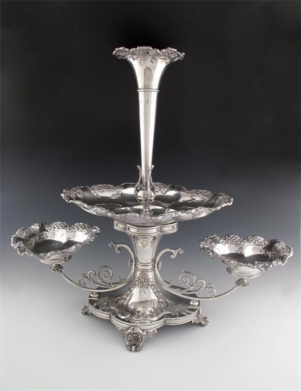 shaped oval form, with a central tapering trumpet vase with a pierced foliate border, large central shaped oval dish, with two scroll arms each holding a heart shaped dish with pierced borders, the raised base on four shell capped scroll bracket feet, length 62.5cm, height 56.5cm, approx. weight 148oz.