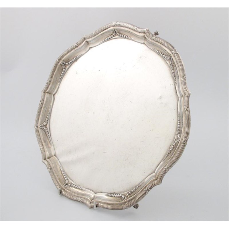 circular form, ribbon and reed border with swag decoration, on three scroll feet, diameter 34.3cm, approx. weight 35oz.