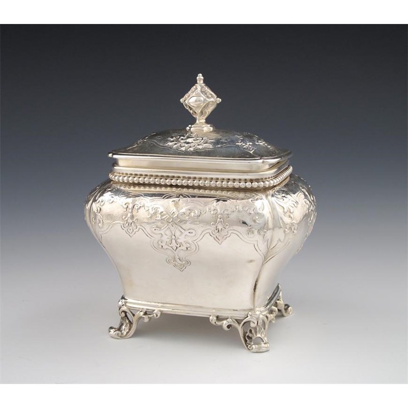 rounded rectangular bombe form, chased foliate decoration on a matted background, the hinged cover, beaded border, on four pierced bracket feet, length 13.4cm, approx. weight 15oz.