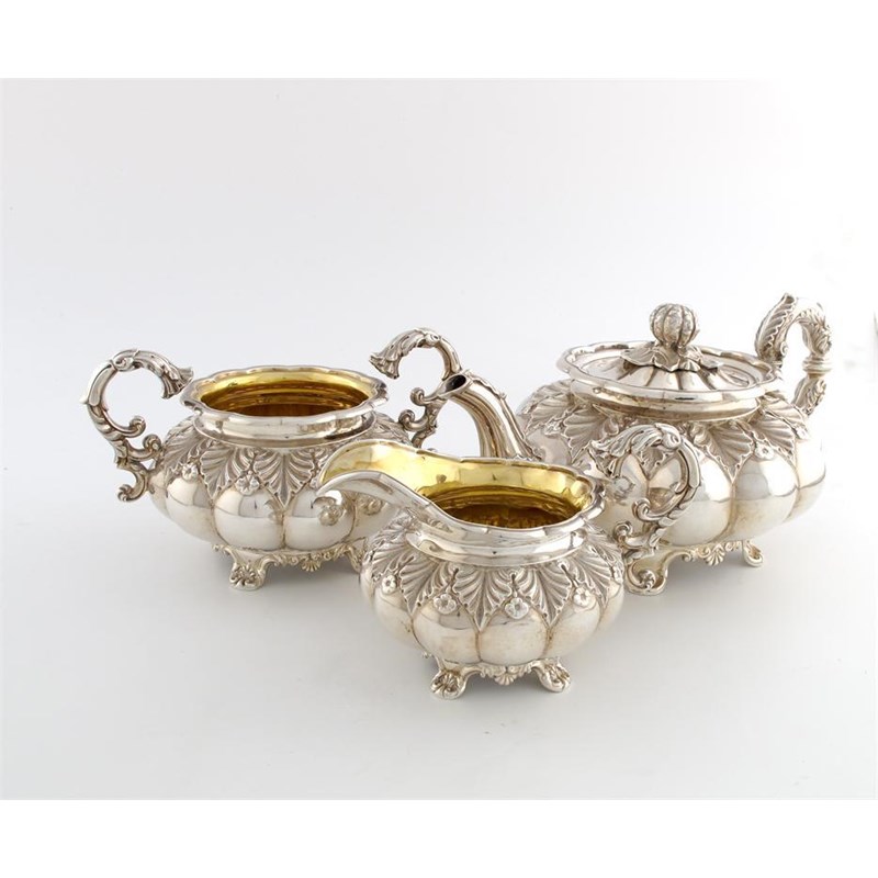 circular lobed form, embossed foliate decoration, leaf capped scroll handles, on four shell bracket feet, engraved with a crest, approx. weight 55oz. (3)