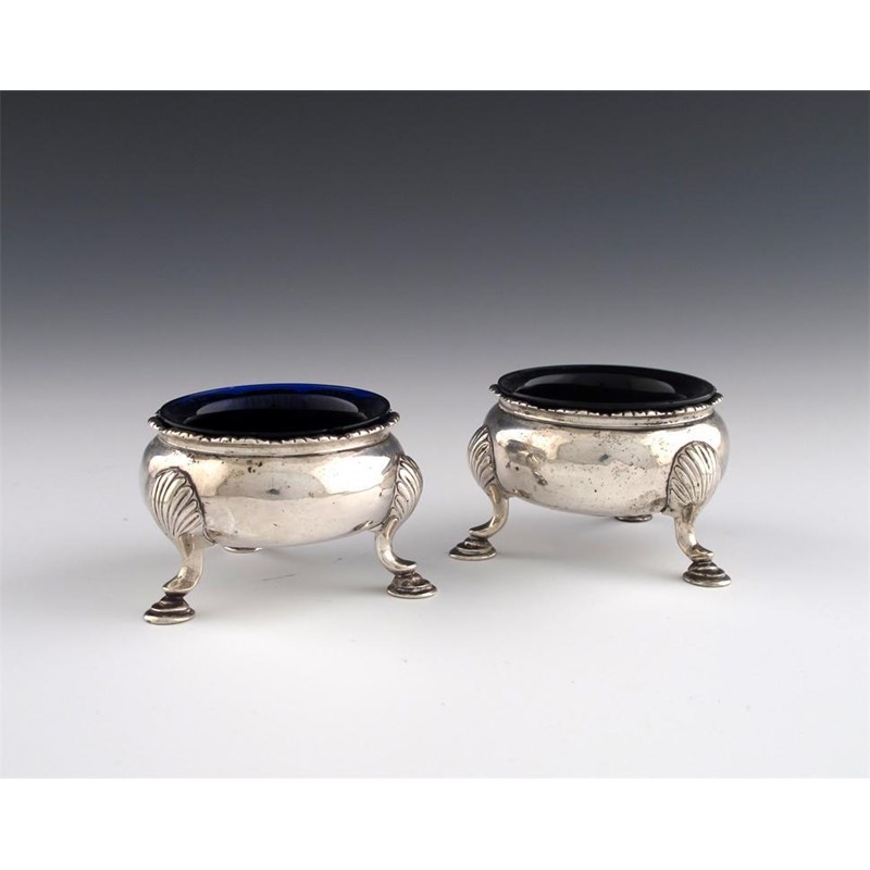 circular form, gadroon border, on three shell-capped hoof feet, with later blue glass liners, approx. weight 6oz. (2)
