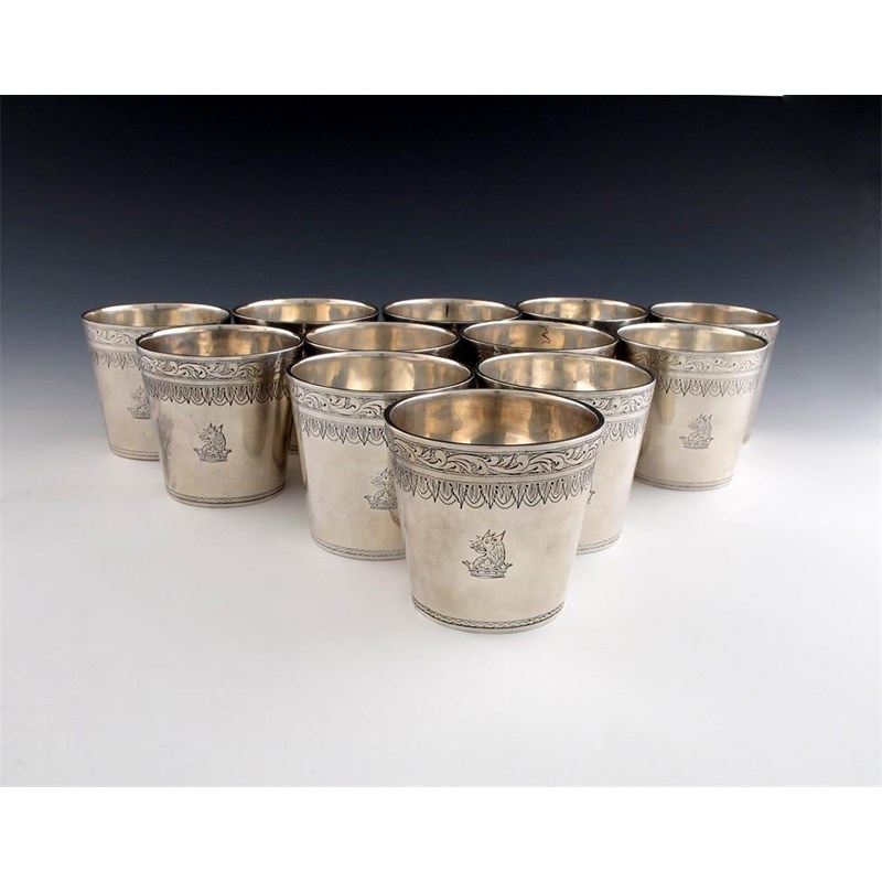 tapering circular form, engraved borders and engraved with a crest, height 7.8cm,