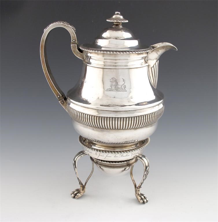 circular bellied form, central fluted girdle, leaf capped scroll handle, flush hinged domed cover,the stand and burner of circular form, gadroon border inscribed to base 'Catherine M Jones from her Brother Edward Laurence 20th April 1816', height 29.5cm, approx. weight 36oz. (2)
