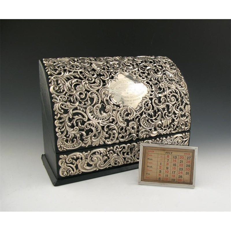 arched rectangular form, the hinged cover with pierced and embossed foliate scroll decoration, the cartouche with a presentation inscription, height 21.2cm, length 31.4cm, plus a silver framed calendar, rectangular form, ribbon tied mantle, Chester 1913, length 10.6cm. (2)