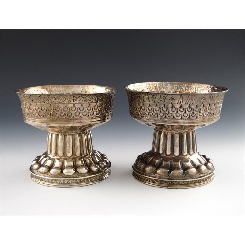 modelled as the Holm's Cup of 1521, on raised lobed circular bases, 10.4cm, approx. weight 20oz. (2)