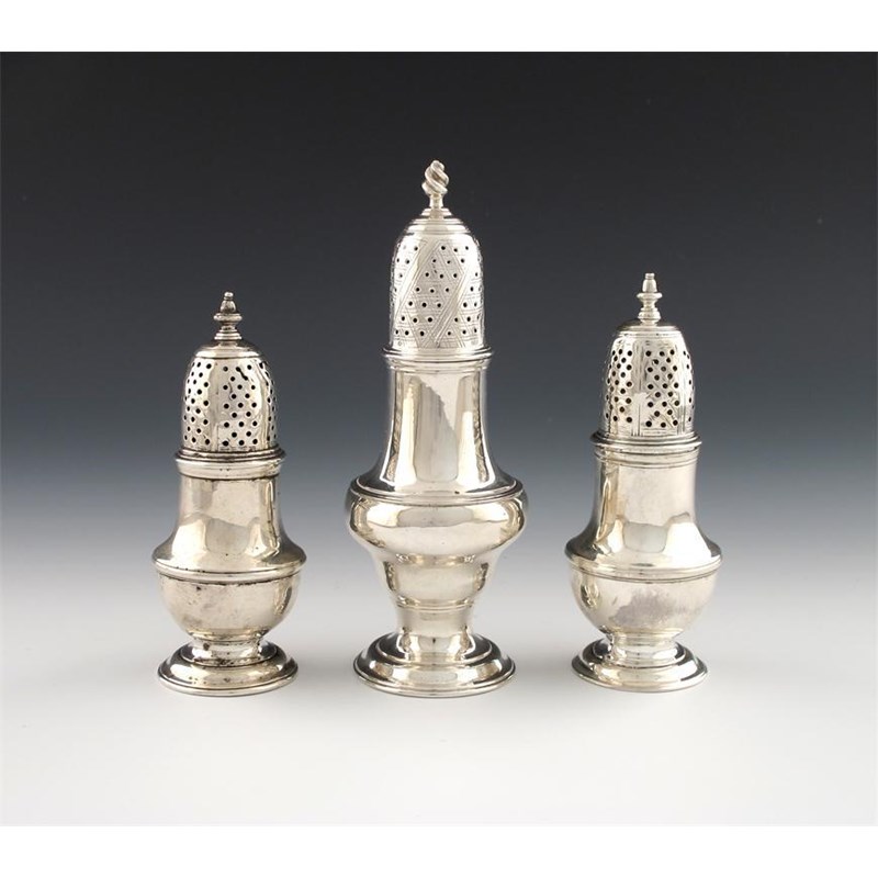 baluster form, on a raised circular foot, plus two George II silver pepper pots of similar design, approx. weight 7oz. (3)