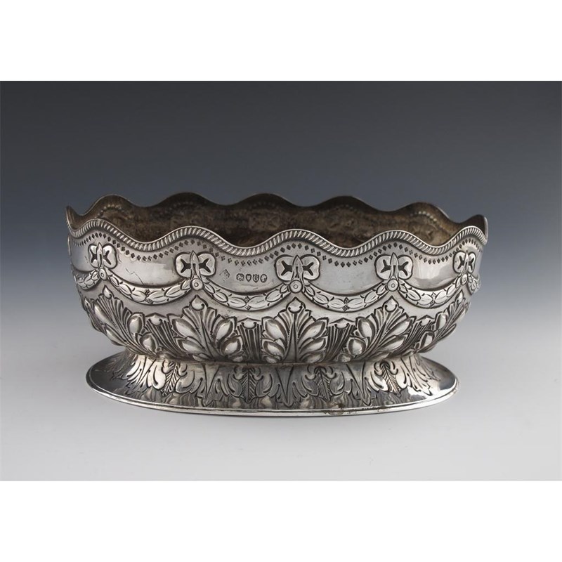 oval form, wavy edge rim and gadroon border, embossed foliate and ribbon-tied decoration, on an oval foot, engraved with a crest, length 19.2cm, approx. weight 10oz.