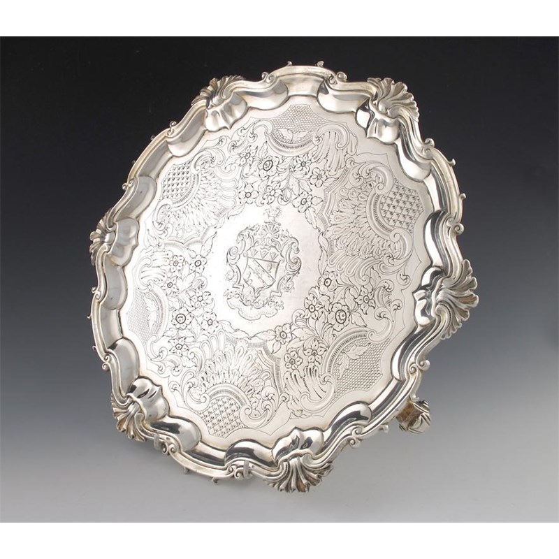 circular form, shell and scroll border, the centre with chased foliate and scroll decoration, and engraved with an armorial, on three gnarl feet, diameter 37cm, approx. weight 50oz.