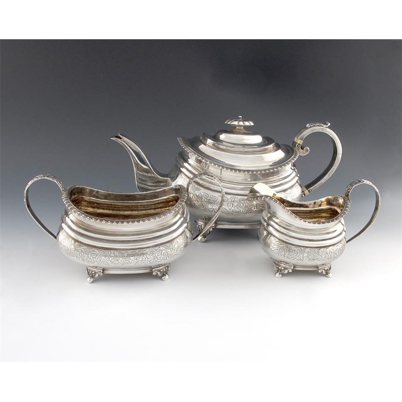 rounded rectangular form, leaf capped fluted scroll handle, chased foliate girdle and gadroon border, on four leaf capped bracket feet, approx. weight 33oz. (3)