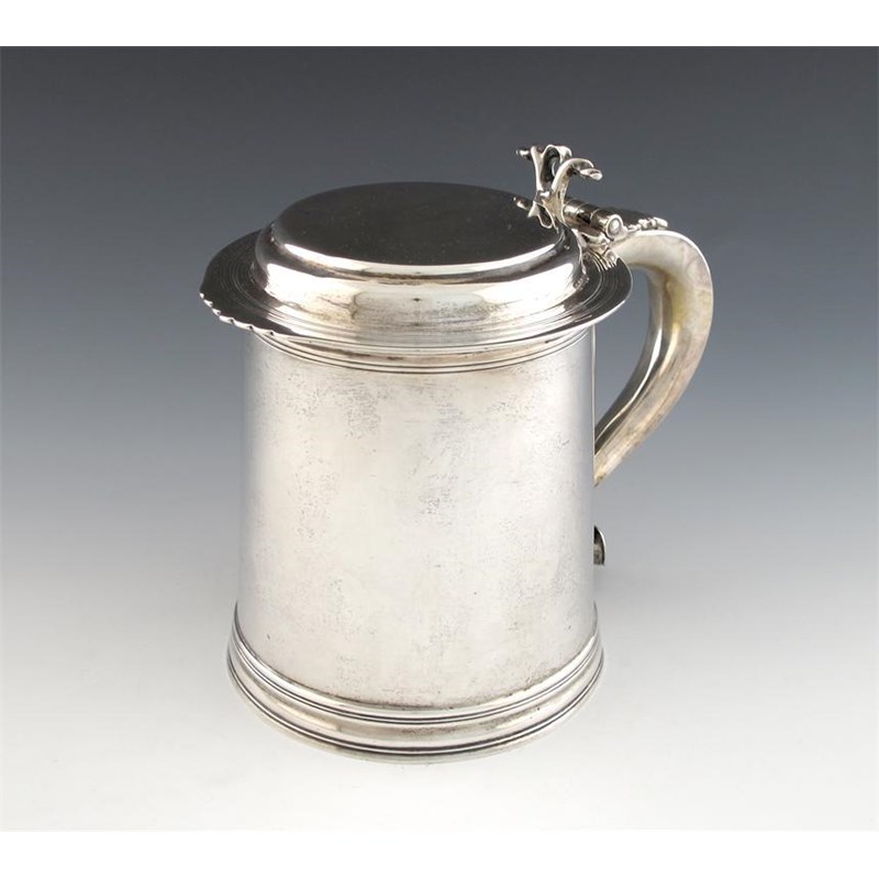 in the late 17th century manner, tapering circular form, flat hinged cover with a scroll thumb-piece, height 17.5cm, approx. weight 35oz.