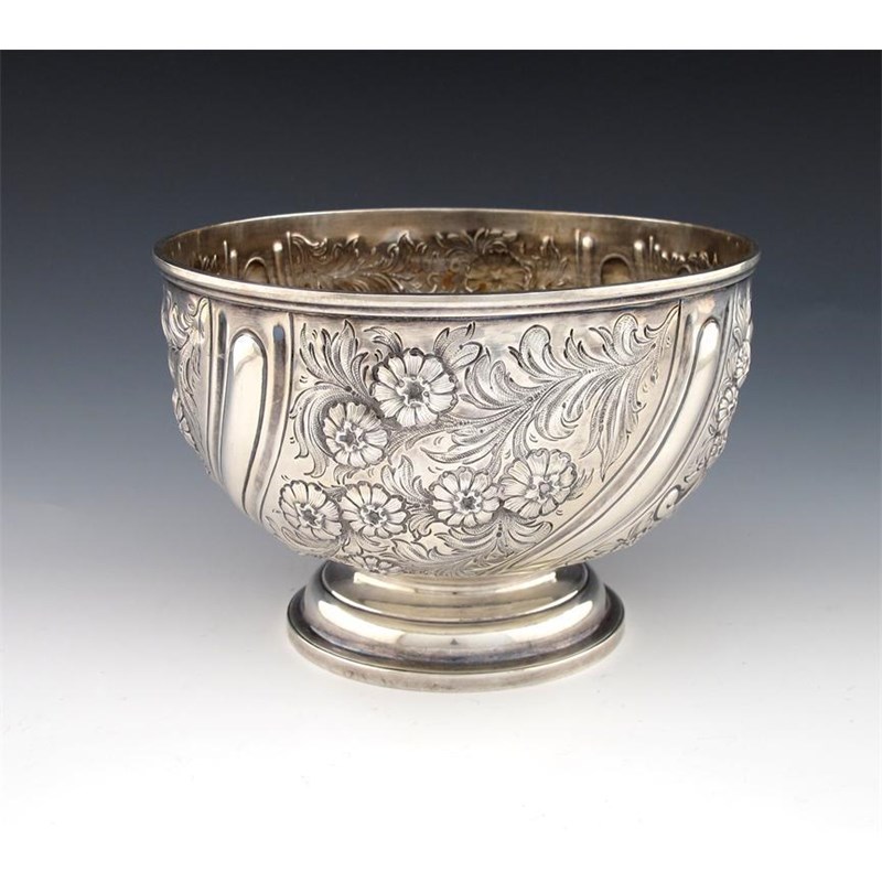 with embossed garlands of flowers and fluting, on a raised circular foot,