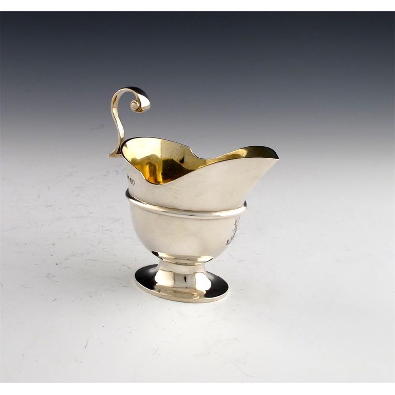 oval helmet form, scroll handle, on a raised oval foot, gilded interior, central girdle, and engraved with a crest, height 11.2cm, approx. weight 5.5oz.