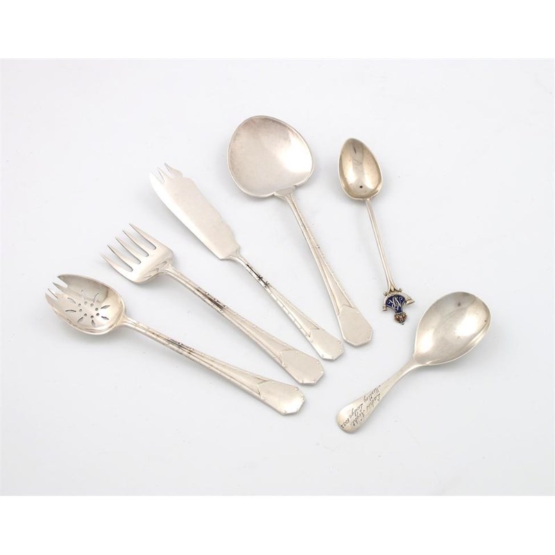 comprising: a four-piece serving set, with rivet borders, comprising: a sardine fork, a chutney spoon, a jam spoon and a butter knife, plus a caddy spoon and a spoon with an enamel terminal, approx. weight 4oz. (6)