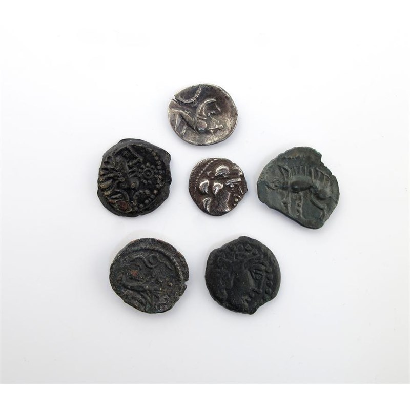 Uncertain Continental Silver Units (2), 'Greek'head right, rev Celticized horse right, 1.3mm, very fine; another, crude style, 1gm; Bronze Unit, Romanized head right, rev eagle and serpent, 3.4gms; and other Bronze (3). Mostly fine.