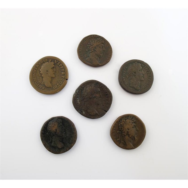 Roman, Antoninus Pius (AD 138-161), bronze Sestertii, Rome mint, c AD 141-143, laureate head right, rev River God Tiber reclining (S 1272), quite rubbed, fair to fine; others (2), both revs Mars with lance; with other coins, generally fair to fine. (6)