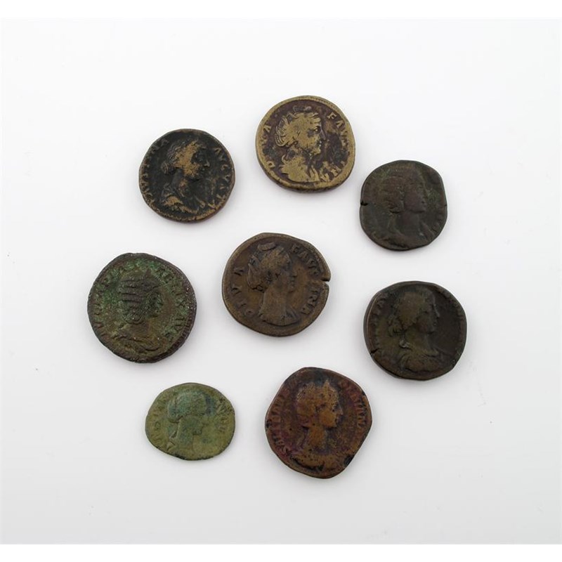 Roman, Faustina Snr, wife of Antoninus Pius, bronze Sestertii (2), Rome, posthumous issue, draped bust right, rev Aeternitas standing; other Sestertii (5), including Julia Domna, and smaller (1), all female portraits. Generally fine or nearly so. (8)