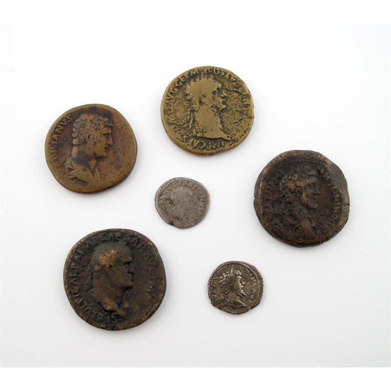 Roman, Septimius Severus (AD. 193-211), silver Denarius, Rome mint, 201, laureate bust right, rev military trophies and captives, good fine; another, Vespasian, worn; Hadrian (117-138), bronze Sestertius, rev Hadrian on horseback, addressing troops, reverse fair, obverse better; other Sestertii (3), fair to fine. (6)