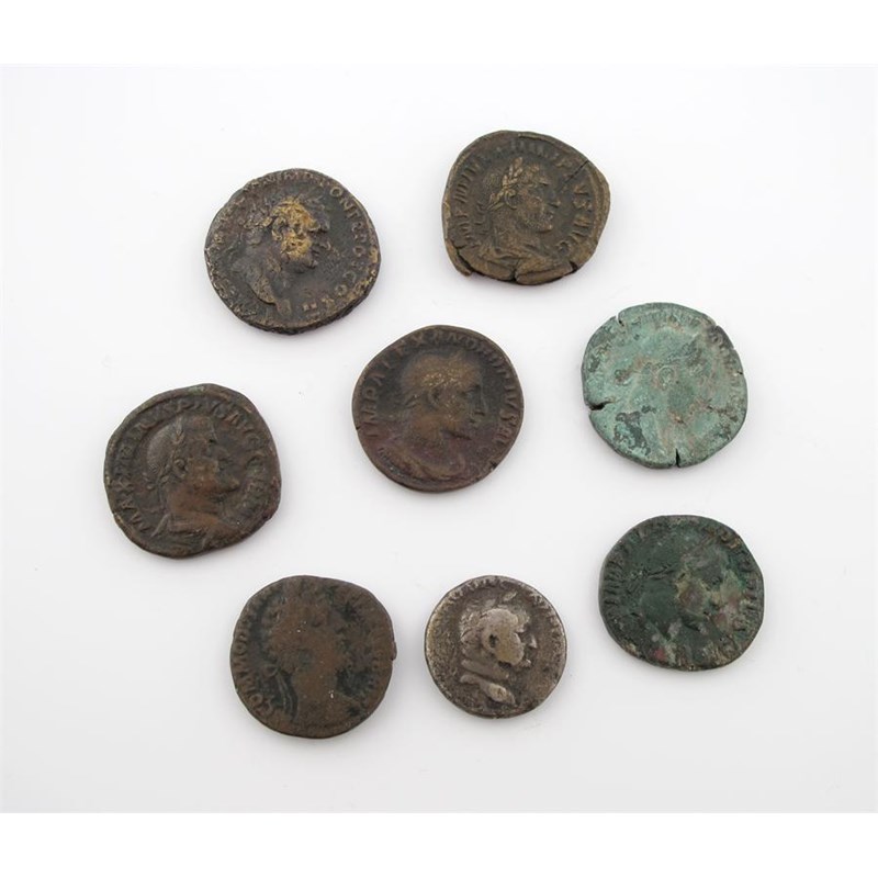 Roman bronze coinage (8), Sestertii (7), and a late Ptolomaic base Tetradrachm. Generally fair, perhaps a little better, one with green patina. (8)