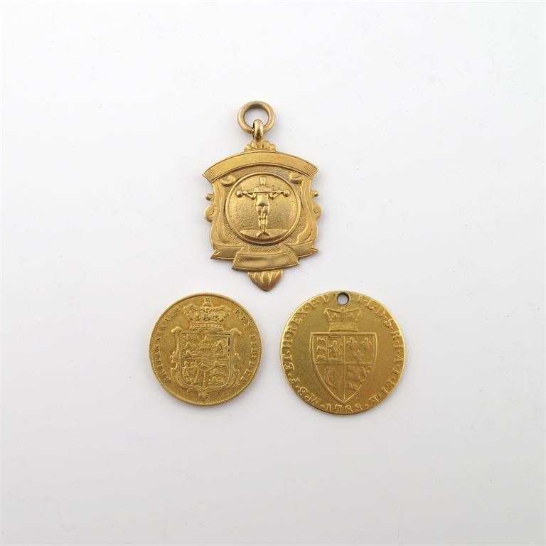 George IV, Sovereign, 1825, bare head (S 3801), fine; George III, '"Spade" guinea, 1788, worn, pierced; and a gold medallic shield for weight lifting,