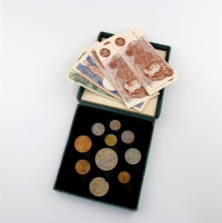 George VI, Festival of Britain, 1951, Proof Set of coins, Crown to Farthing, in green card case of issue, virtually mint state; Banknotes: £1, Peppiatt (2), in sequence, others (5); 10/-, Beale (8 - 7 in sequence) and Fforde (9 - some in sequence), very fine and better. (lot)