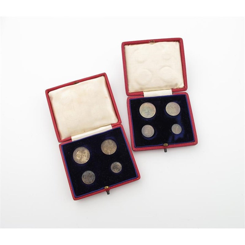 Edward VII, Maundy Sets (2), 1906, 1908, in red leather fitted cases. Extremely fine. (2)