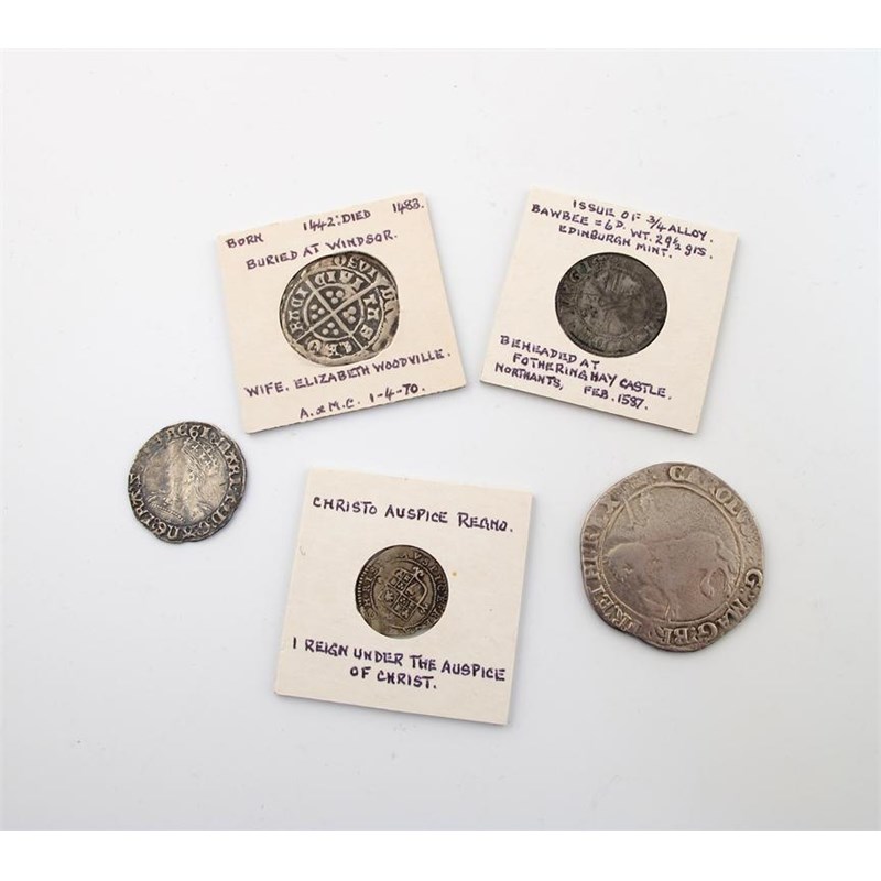 Mary, Groat, mm pomgranate (S 2492); with Groat, Edward IV and Mary, Queen of Scots, Bawbee; Charles I, Tower Mint, Halfcrown, mm crown; Charles II, hammered Twopence. Fair to fine, last better. (5)