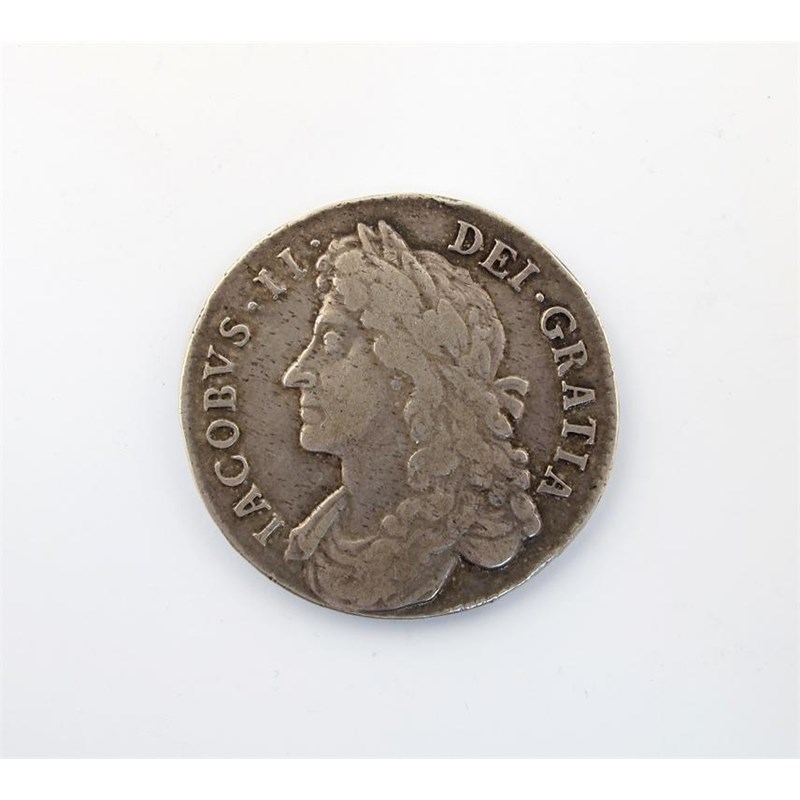 James II, Halfcrown, 1687, first bust, edge TERTIO, laureate bust left, rev cruciform shields (ESC 498; S 3408). Lightly haymarked, nearly very fine.