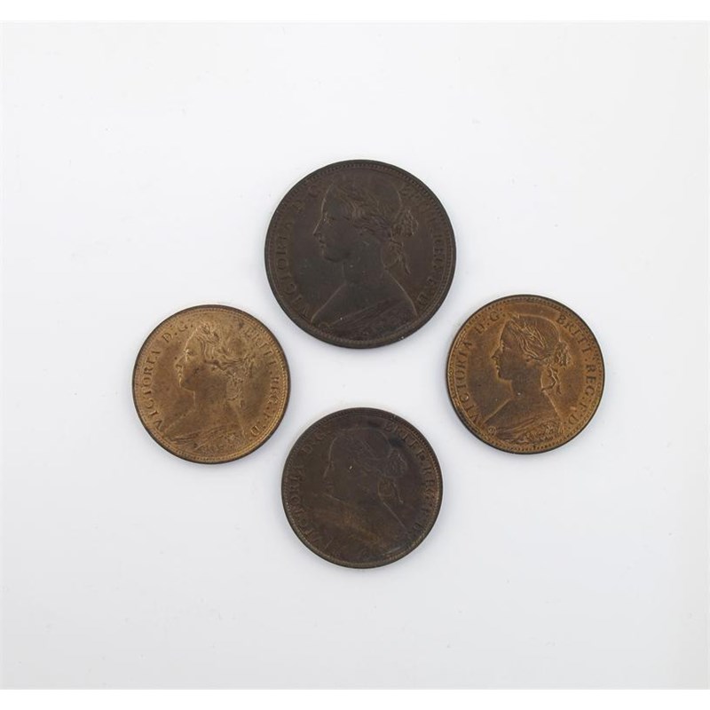 Victoria, bronze Penny, 1862; Halfpennies (3), 1860, beaded border, 1874, 1881 (S 3954, 3956). Penny and 1874 very fine, other two nearly extremely fine with much original colour. (4)