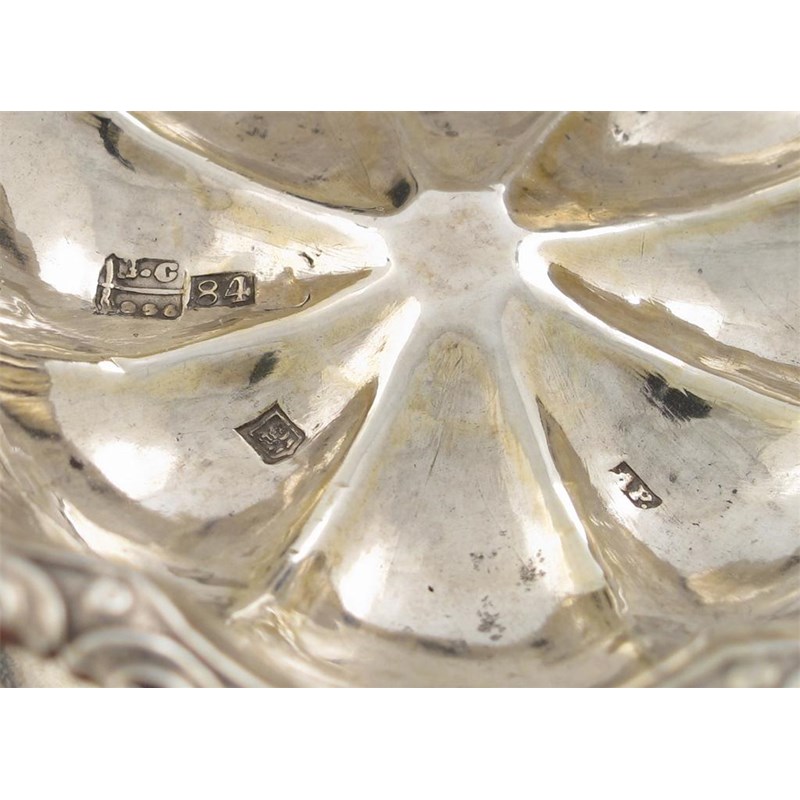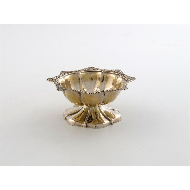 lobed circular form, foliate and shell border, on a raised circular foot, with traces of gilding, diameter 8.3cm approx. weight 1.5oz.