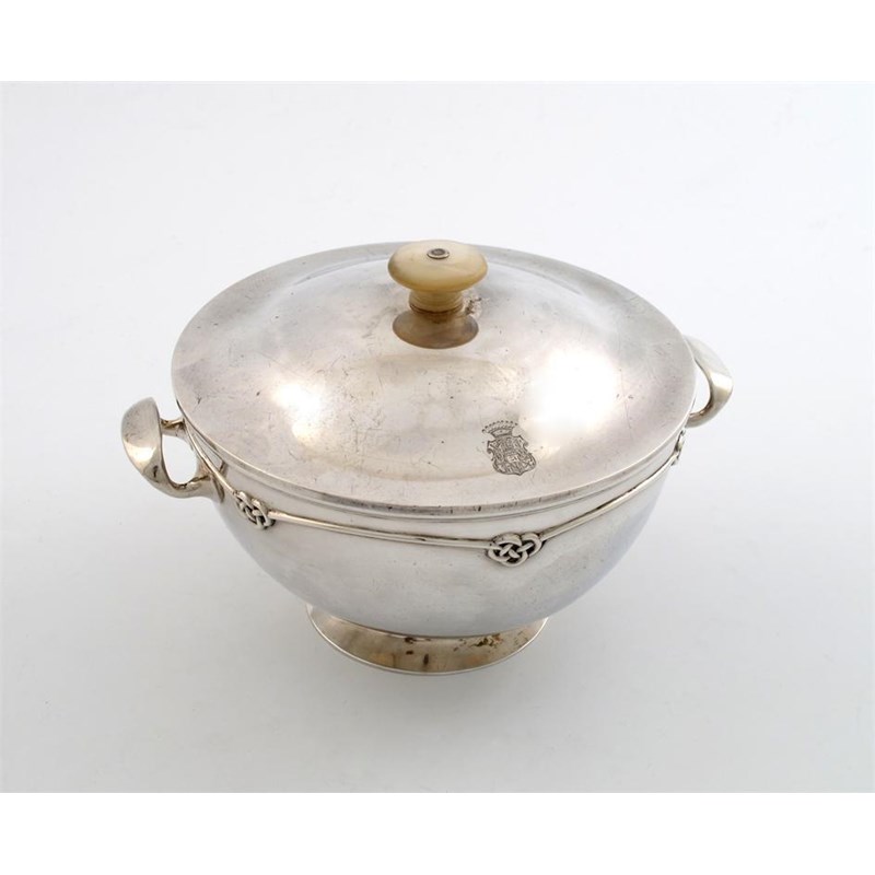 circular tapering form, with an intertwined girdle and plain side handles, domed pull-off cover with a mother-of-pearl finial, gilded interior, engraved with two armorials, on a raised circular foot, diameter 14.5cm, approx. weight 16oz.