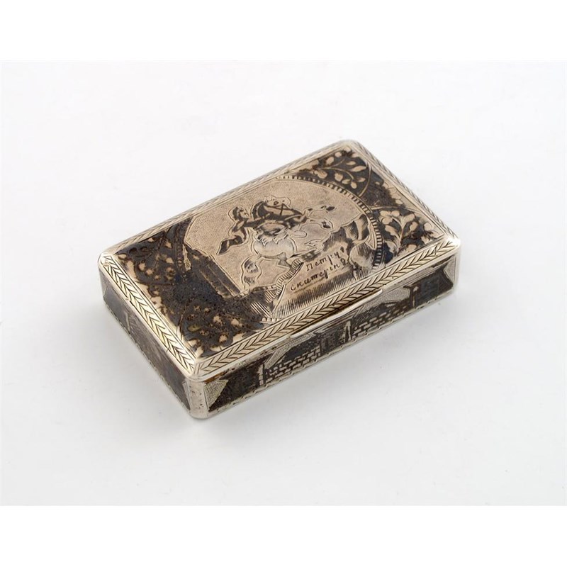 rectangular form, the hinged cover with a scene of a warrior on horse back, the base with military trophies, the sides with architectural scenes, length 7.6cm, approx. weight 2.6oz.