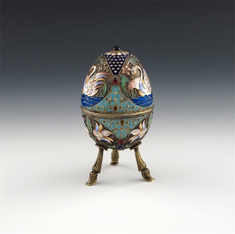 the polychrome enamel depicting three swans and foliate scroll decoration, set with three coloured stones, on three hoof feet, height 9.5cm.