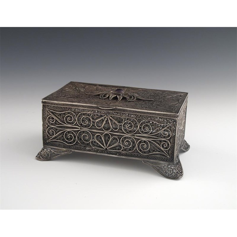 rectangular form, foliate scroll decoration, hinged cover, on four bracket feet, length 16.7cm.