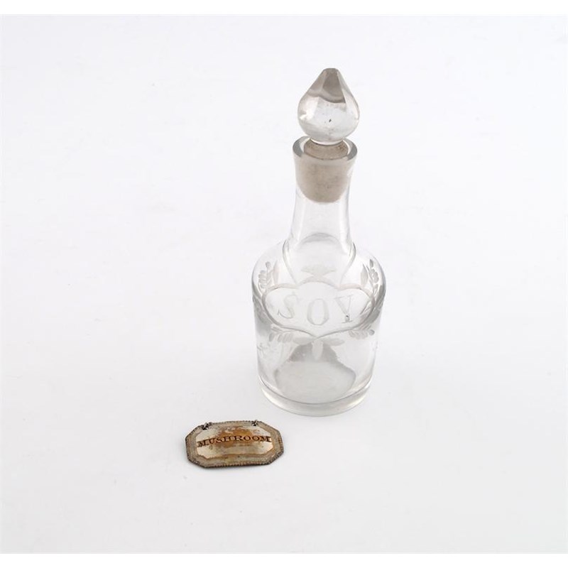 mallet form, faceted stopper, with an engraved sauce label, titled 'SOY', height 12cm.
