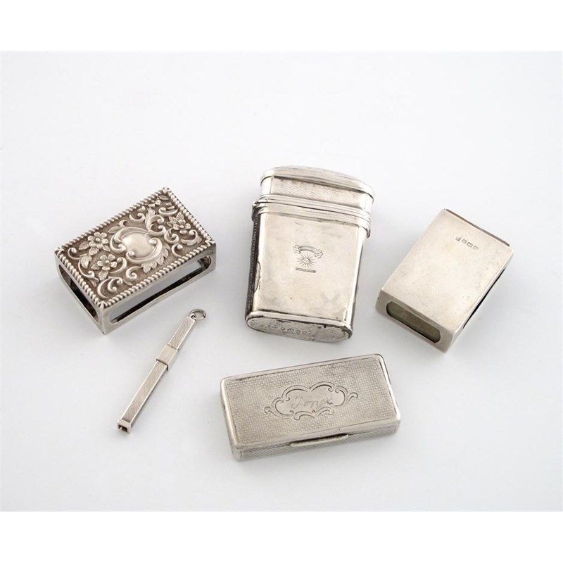 comprising: an William IV etui case with a later striker attachment, London 1835, a lighter with engraved foliate decoration, two match box covers a toothpick and an unmarked continental silver snuff box. (6)