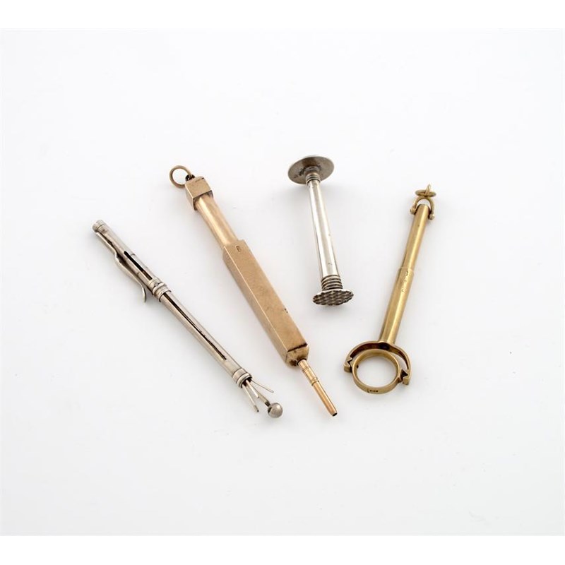 with a revolving terminal, push action, plus a 9 carat gold retractable pencil, an unmarked silver pipe tamper and spike and a swizzle stick. (4)