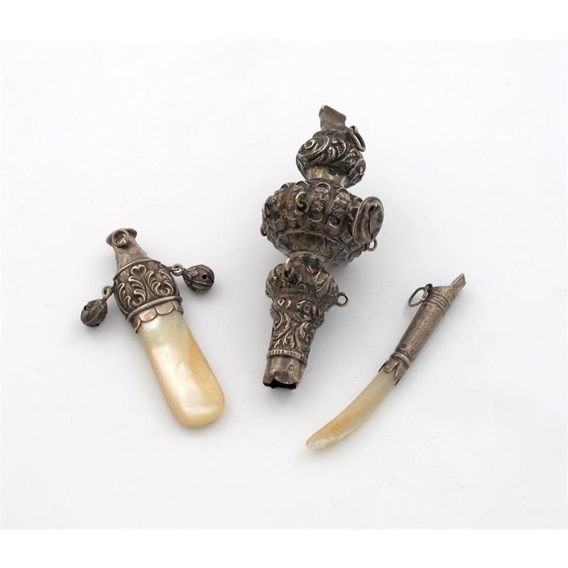 baluster form, embossed foliate decoration, lacking coral teether and bells, plus a Victorian silver whistle with a mother-of-pearl handle, and another baby's whistle. (3)