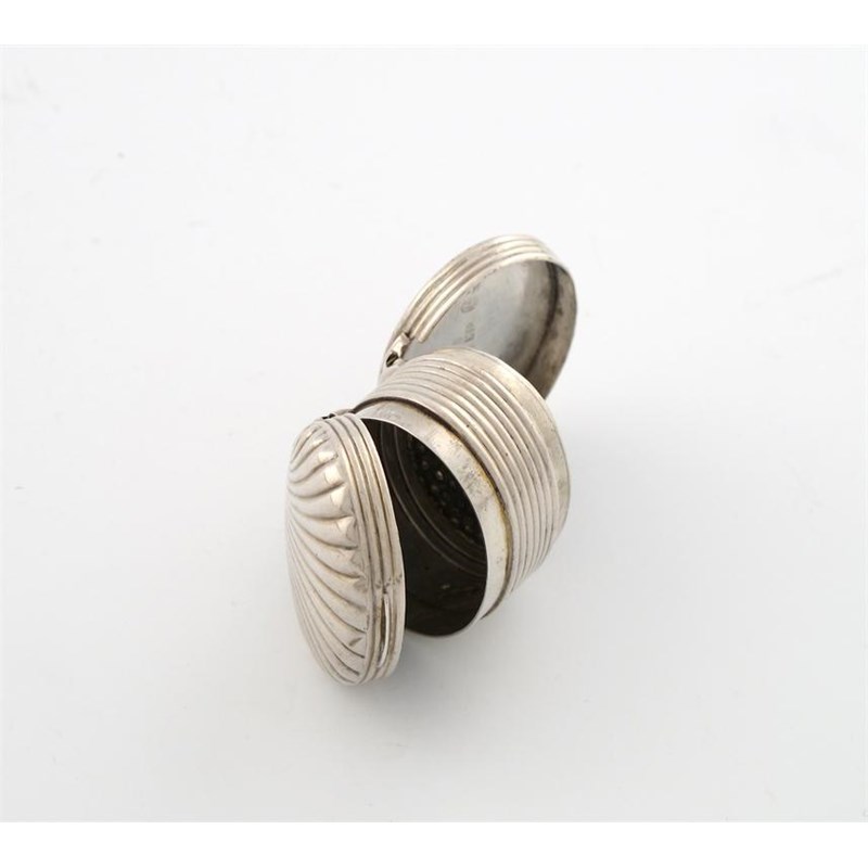 oval form, fluted hinged cover, plain hinged base, length 3.3cm.