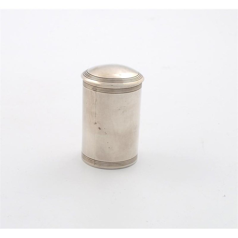 plain cylindrical form, pull-off domed cover, reeded borders, height 4.8cm, approx. weight 1oz.