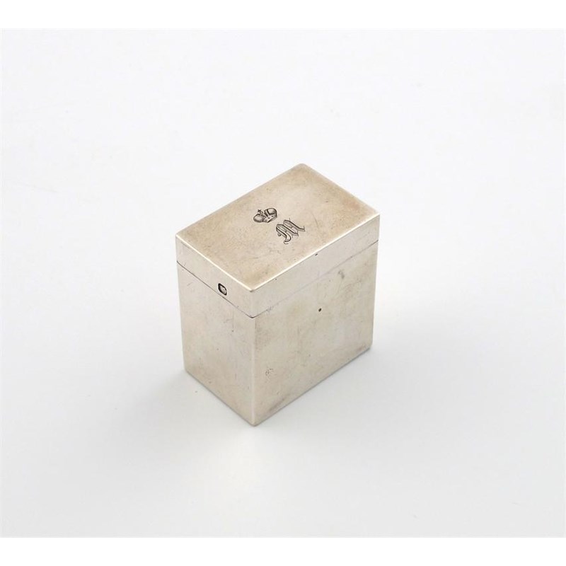 plain rectangular form, gilded interior, the pull-off cover with a crowned 'M', height 4cm, approx. weight 1.5oz.
