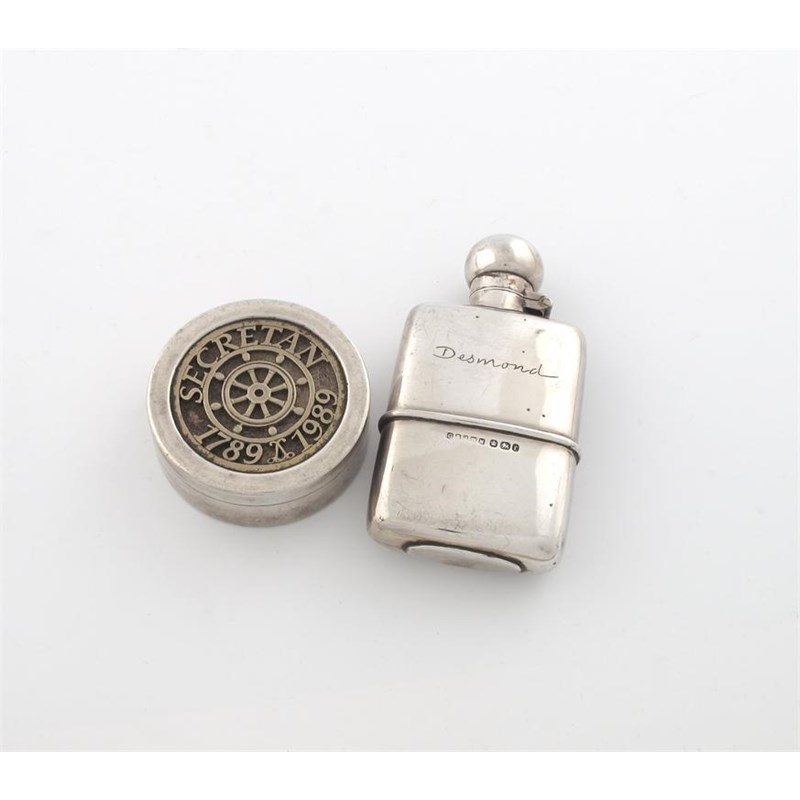 circular form, the pull-off cover with a gilt ship's wheel and 'SECRETAN 1789-1989', plus a small silver hip flask, with a pull-off drinking cup, inscribed, Sheffield 1895, approx. weight 5oz. (2)