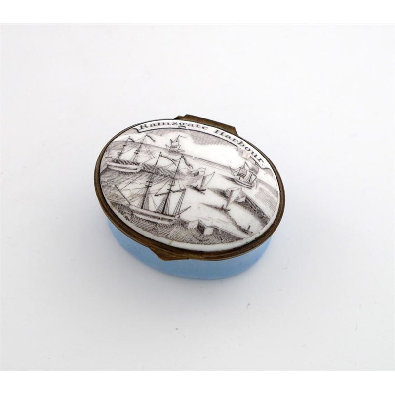 of oval form, the hinged cover with a scene of Ramsgate Harbour, the base with a powder blue ground, the interior with a fitted mirror, length 4.2cm.