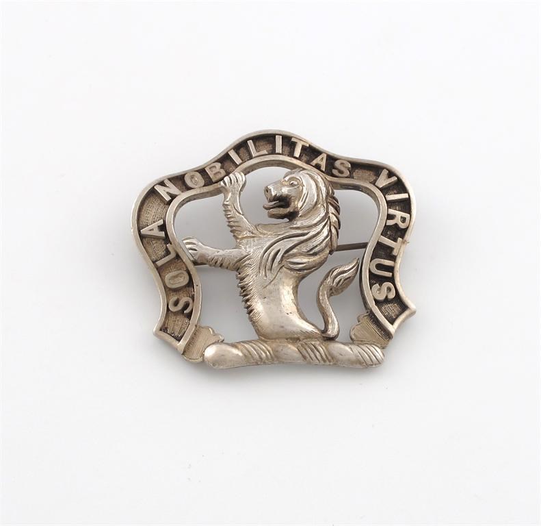 A shaped Irish Clan Badge of the Blake (Baron Wallscourt) family, a demi mountain cat left, motto on ribband around, SOLA NOBILITAS VIRTUS [Virtue is the sole of nobility], 45 x51mm, c. 1880.