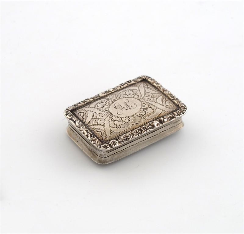 rectangular form, engraved decoration, foliate borders, initialled, the interior with a pierced foliate grille, length 3.5cm.