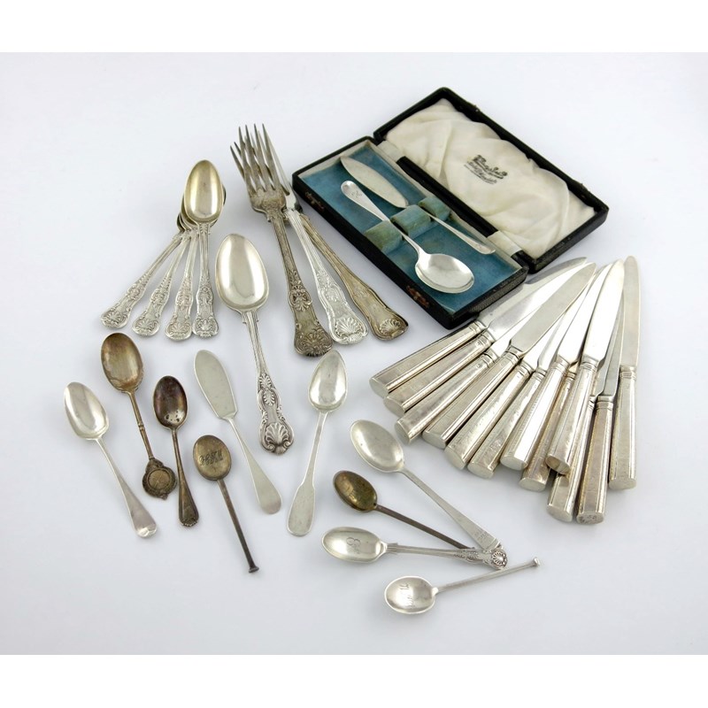 comprising: a Kings pattern table fork, a Kings Hourglass pattern table fork, a Queen's pattern table fork, plus a desert spoon, thirteen teaspoons, a butter knife, a cased jam spoon and butter knife, and a set of twelve silver handled Feather-edge pattern dessert knives, with unmarked and untested blades, approx. weighable 21oz. (qty)