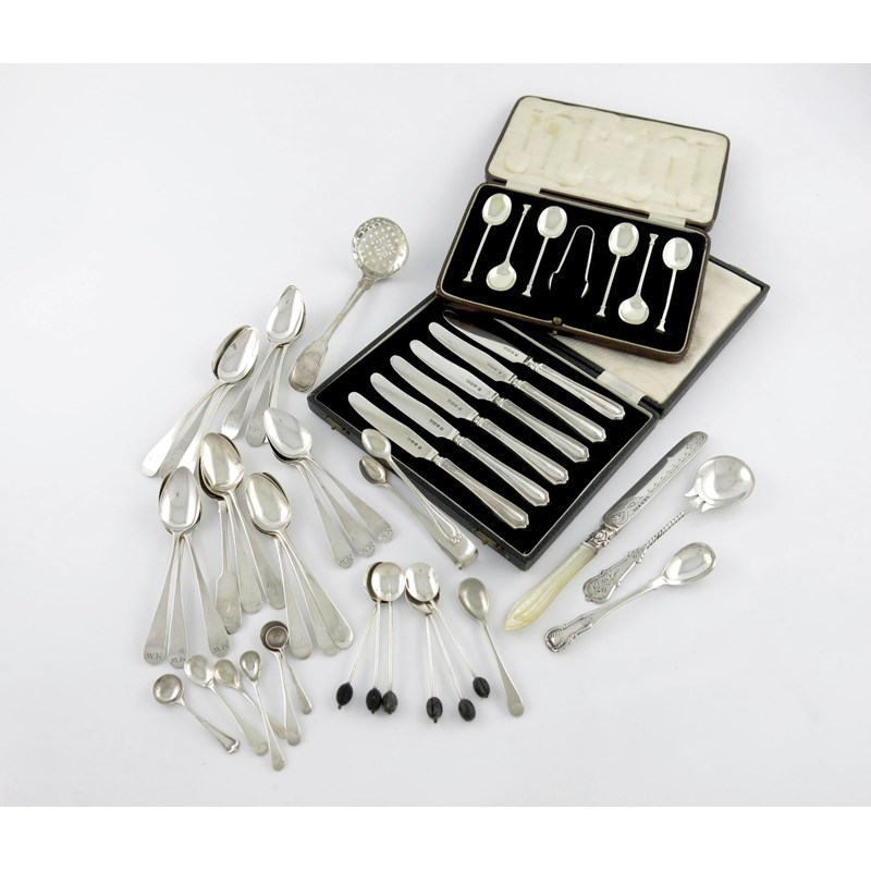 comprising: a Victorian Fiddle and Thread sifting spoon, two sets of six Newcastle teaspoons, a cased set of six teaspoons, a cased set of six tea knives, six teaspoons, a Scottish mustard spoon, six coffee bean-end spoons, six condiment spoons, a pair of sugar tongs, a knife, a Dutch spoon and electroplated condiment spoons, approx. weight 15oz. (qty)