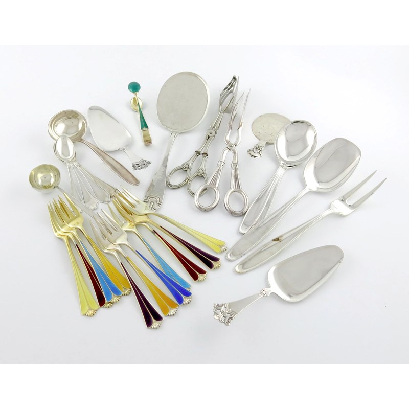 comprising: eleven silver-gilt and enamel cake forks and a pair of sugar tongs, by David Andersen, with varied coloured enamel handles, five serving pieces by David Andersen, four slices, four teaspoons, an unmarked ladle and two pairs of silver-handed serving tongs with plated blades, approx. weighable 25oz. (qty)