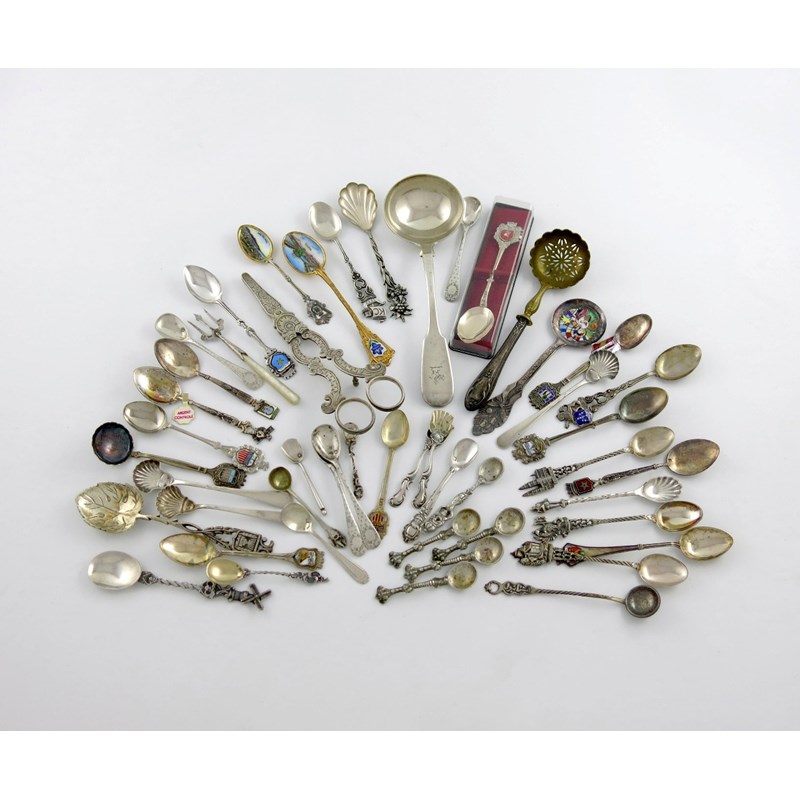 comprising: a William IV sauce ladle, London 1832, a pair of Dutch grape scissors, engraved decoration, plus a quantity of salt spoons and souvenir spoons, approx. weighable 12oz. (qty)