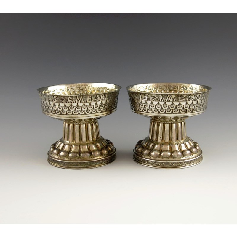 circular bowl with chased decoration and an inscription, on raised circular and fluted bases, with traces of gilding, height 10.2cm, approx. weight 21oz. (2)