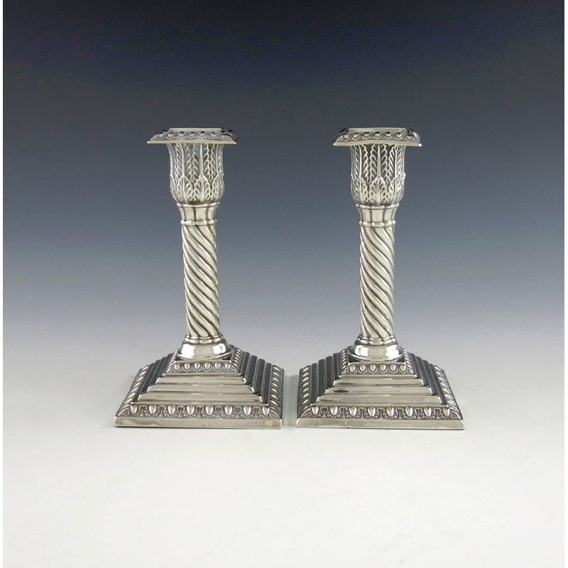 the stems with spiral decoration, acanthus capitals, on square stepped bases with acanthus borders, height 14.5cm. (2)